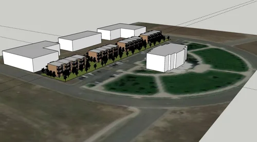 Using the seminary building, the existing Madison County public library, and the historic Rexburg Tabernacle as anchors, I then threaded the block with pedestrian connections and utilized the intersections thereof to create a variety of public spaces befitting their immediate context. A wide, hardscape retail plaza abuts Main Street, with a more tranquil, tree-covered space adjacent to the tabernacle building. A small, landscaped amphitheater serves as both a temporary gathering space as well as a buffer to proposed infill residential development in the quieter areas of the block.